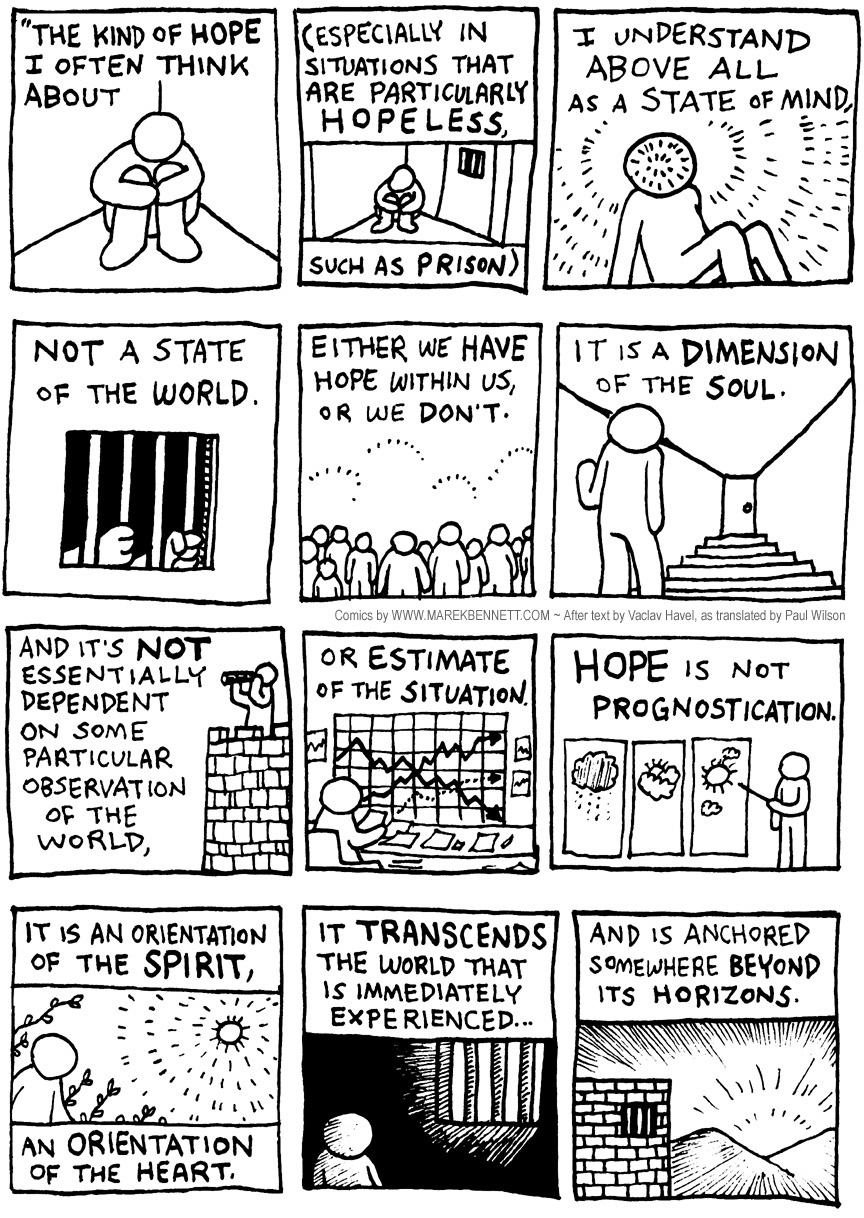 I chose this passage because it seemed especially relevant to the political world I see in my own country now (USA), where a president elected on the slogan “HOPE” still issues orders for remote assassinations over distant horizons around the world… Havel is speaking here as a man who has experienced a life that would come to span the prison cell and, in the near future, the presidential palace.  Drawing it out in comics form helped me clarify what I think he is saying.