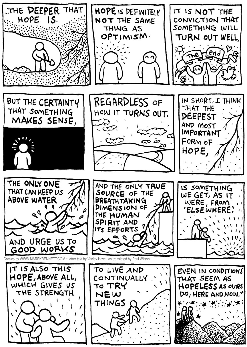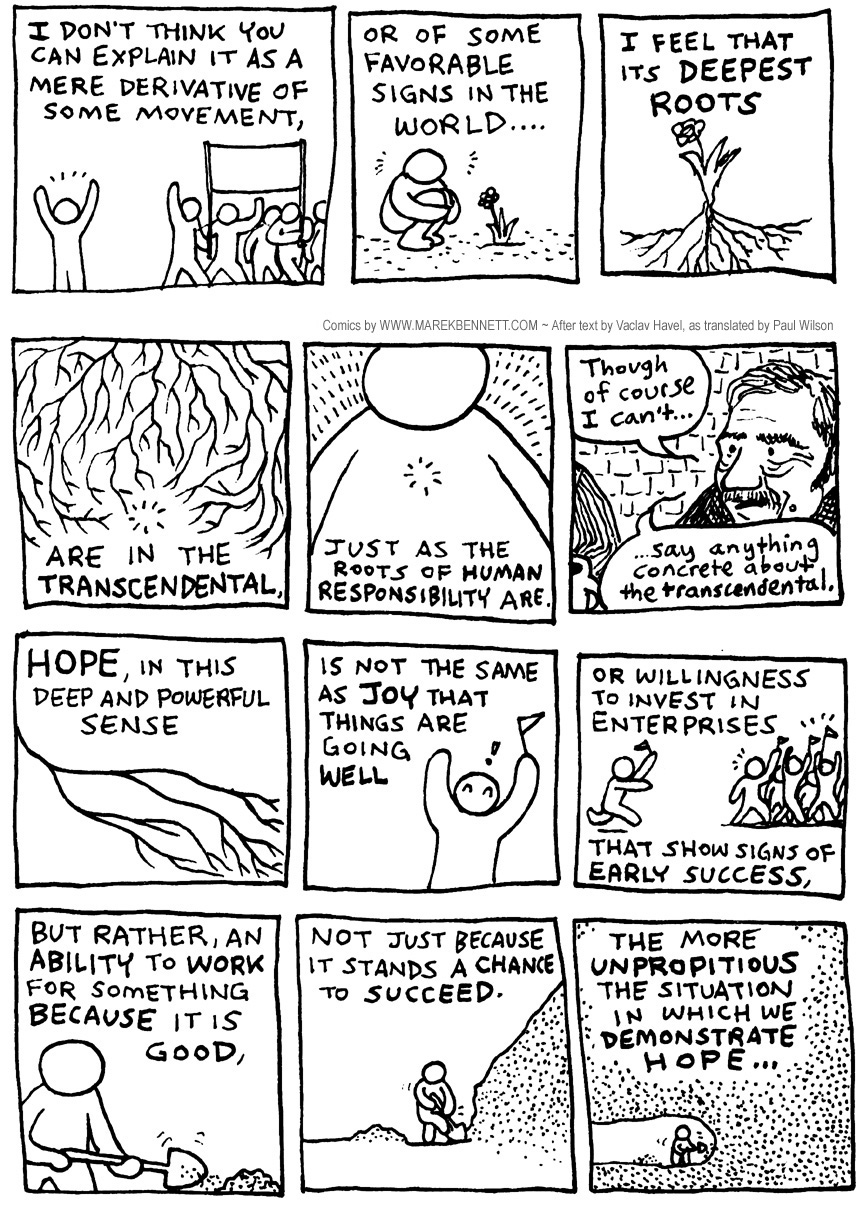 When I read that Vaclav Havel had died, I thought of this passage from a chapter called “The Politics of Hope” in Havel’s book Disturbing the Peace(The words are Havel’s, as translated by Paul WIlson; the comics treatment is my own.)