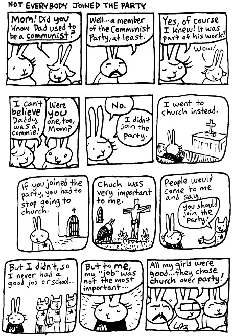 6. I sort of agree with you George . These rabbit cartoons are rather simple, mind numbing and really for young children . Bit old fashioned really, like Rupert Bear used to appear in the Express newspaper in Britain . I am not sure what was so wrong in joining the party, in a communist state ? Those were the rules of the game at the time, if you wanted to get on in life .