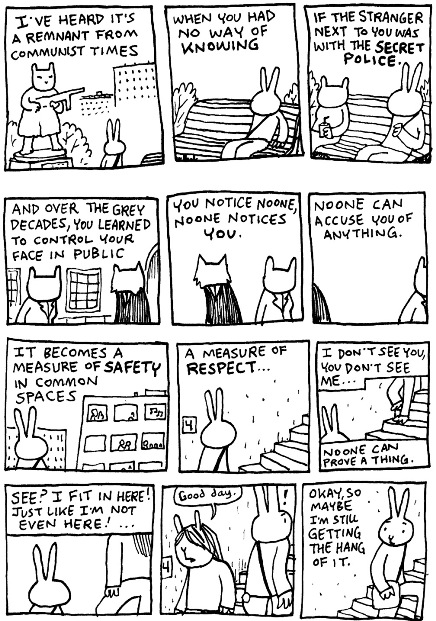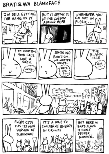Well, I find this comic totally pointless. Anonymity is typical for every bigger city, it is not only the case of Bratislava. I have been in Vienna, Paris, Belgrade, Budapest, Roma and Stuttgart and nowhere was people saying “hello” to stranger spontaneously.